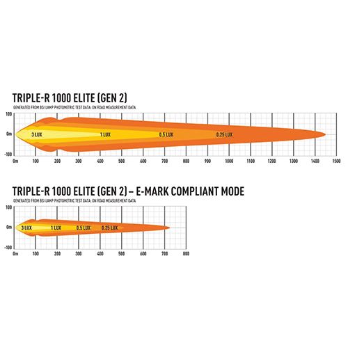 Triple-R 1000 Elite på 104W har testats av professionell motorsport team för att säkerställa att denna generation 2 håller de högt ställda kraven, bäst har blivit bättre. Lazer har här använt den allra senaste LED-tekniken för att i E-Boost läget ge en förbättrad vänster / höger spridning av ljus utan att kompromissa med upp / ner spridningen, vilket säkerställer att rampen ger ett ljus som verkligen imponerar och passar ett brett urval av fordon. Den har en ren och modern design för att passa fler fordon. Ljusrampen är E-godkänd R112 när E-boost inte är aktiverat. Lyser med 1 lux på 679 meter.