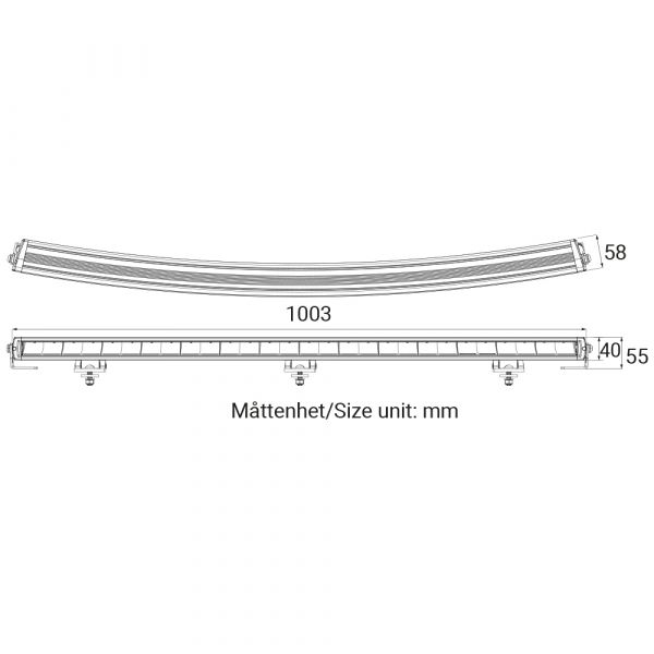 En böjd 1003 mm/40" extraljusramp med positionsljus. Rampen har 28st högeffektiva dioder som tillsammans ger hela 196W. Rampen har en fjärrljusbild och lyser både långt och brett. Den är E-godkänd enligt ECE R112 och lyser med 1 lux på 456 meter. Positionsljuset finns med ett ECE R7 E-godkänt vitt ljus och ett orange stylingljus. Huset är av aluminium och linsen av slagtålig polykarbonat. Fästen för mitt- eller sidomontering medföljer. 2-polig DTP-kontakt med två separata utgående kablar för positionsljus vitt eller orange.