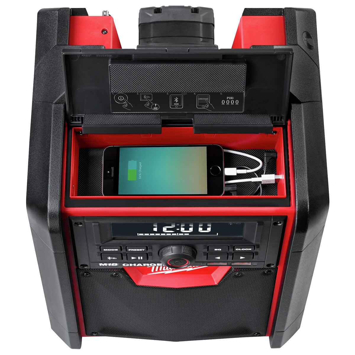 - Inbyggd laddare för snabb och bekväm laddning av samtliga M18-batterier