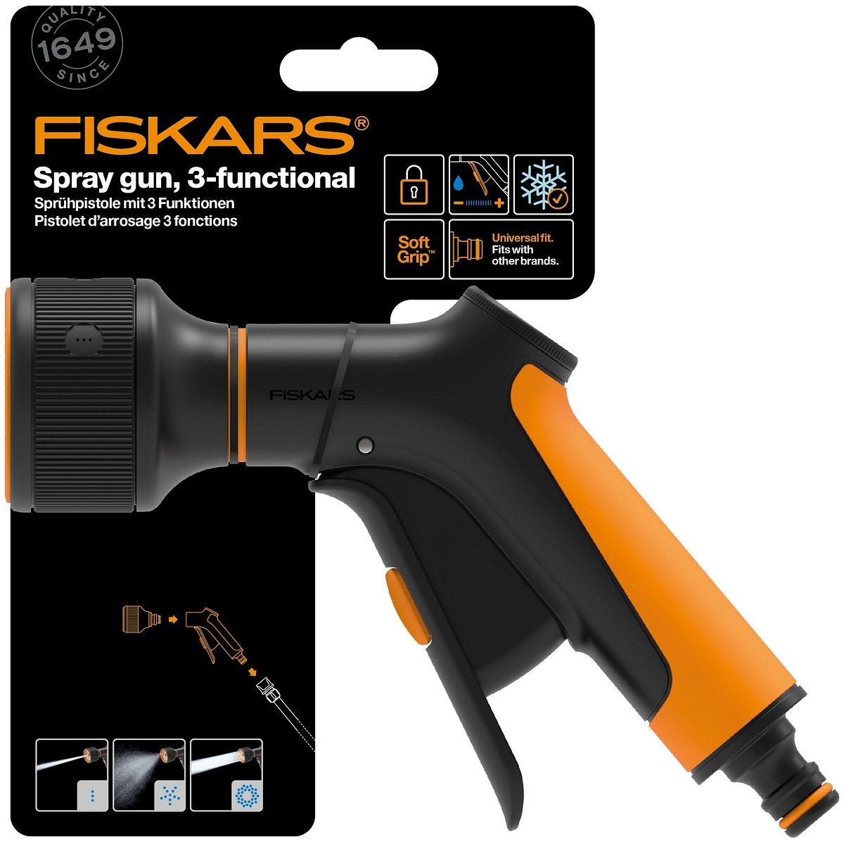 - Fiskars sprinklerpistol med 3 funktioner och steglöst varierande flöde