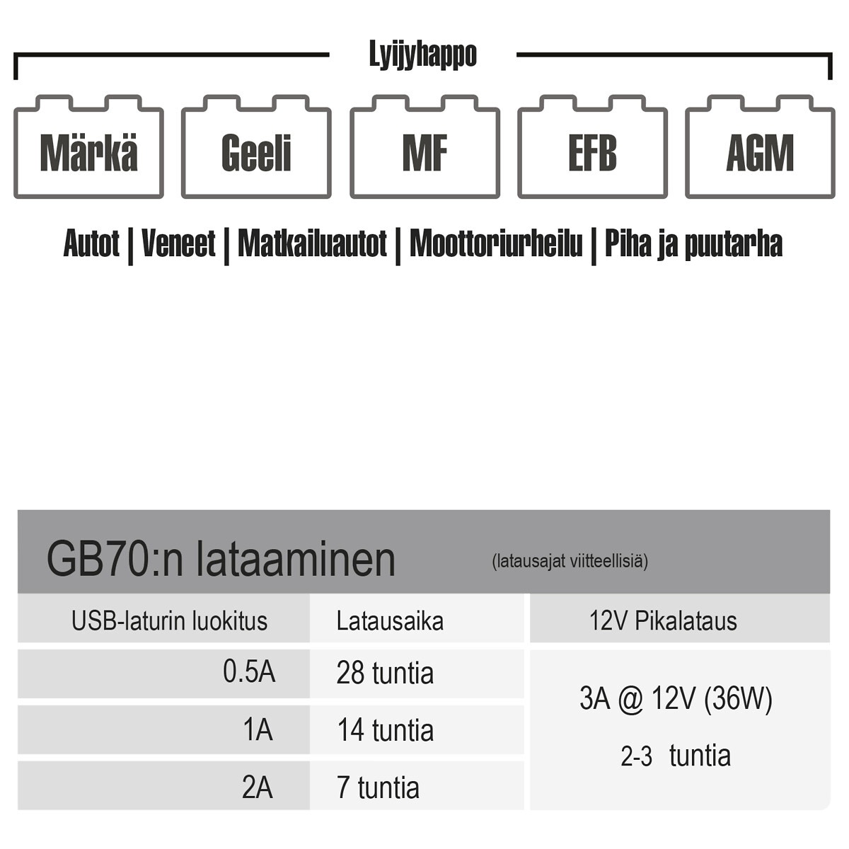 - upp till 20-80 startar (GB20-GB150) på en enda laddning och förblir upptagen i upp till ett år