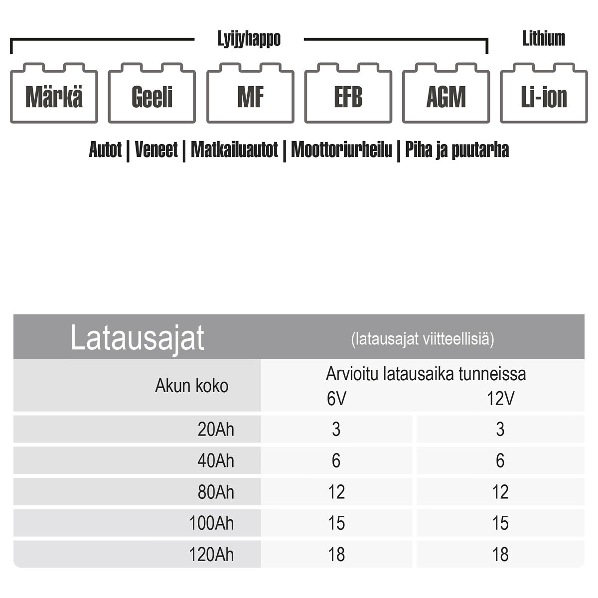 - laddar blyfria, GEL-, AGM- och underhållsfria batterier och litiumjonbatterier