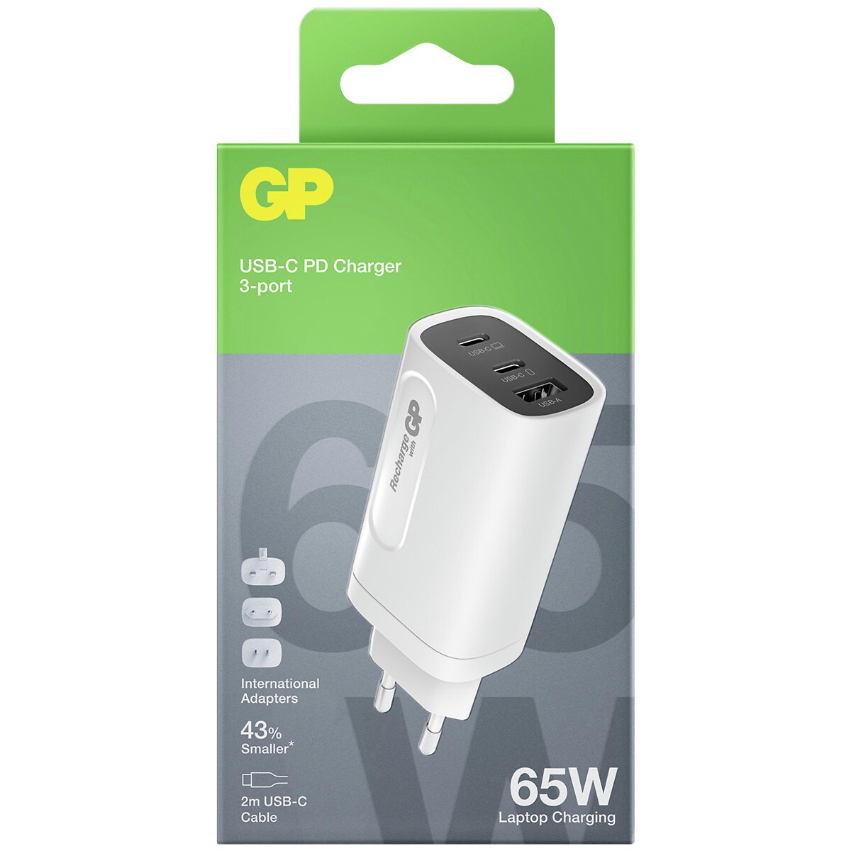 - GP GaN PD 65W Charger låter dig ladda upp till tre enheter samtidigt