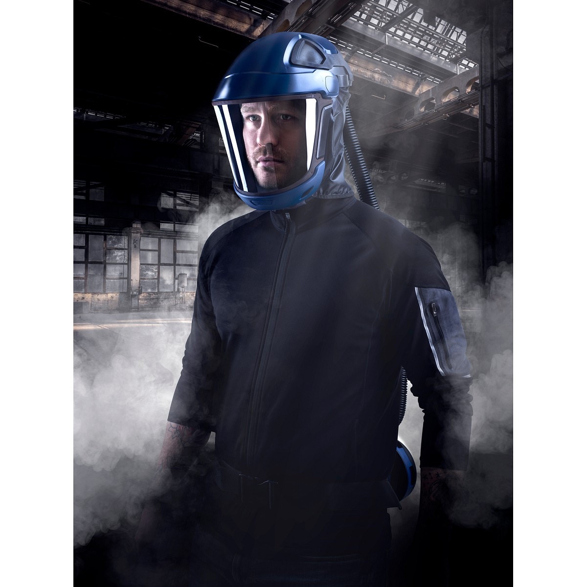 - en robust skärm med uppfällbart visir som ger användaren ett komfortabelt och säkert andnings- och ögonskydd