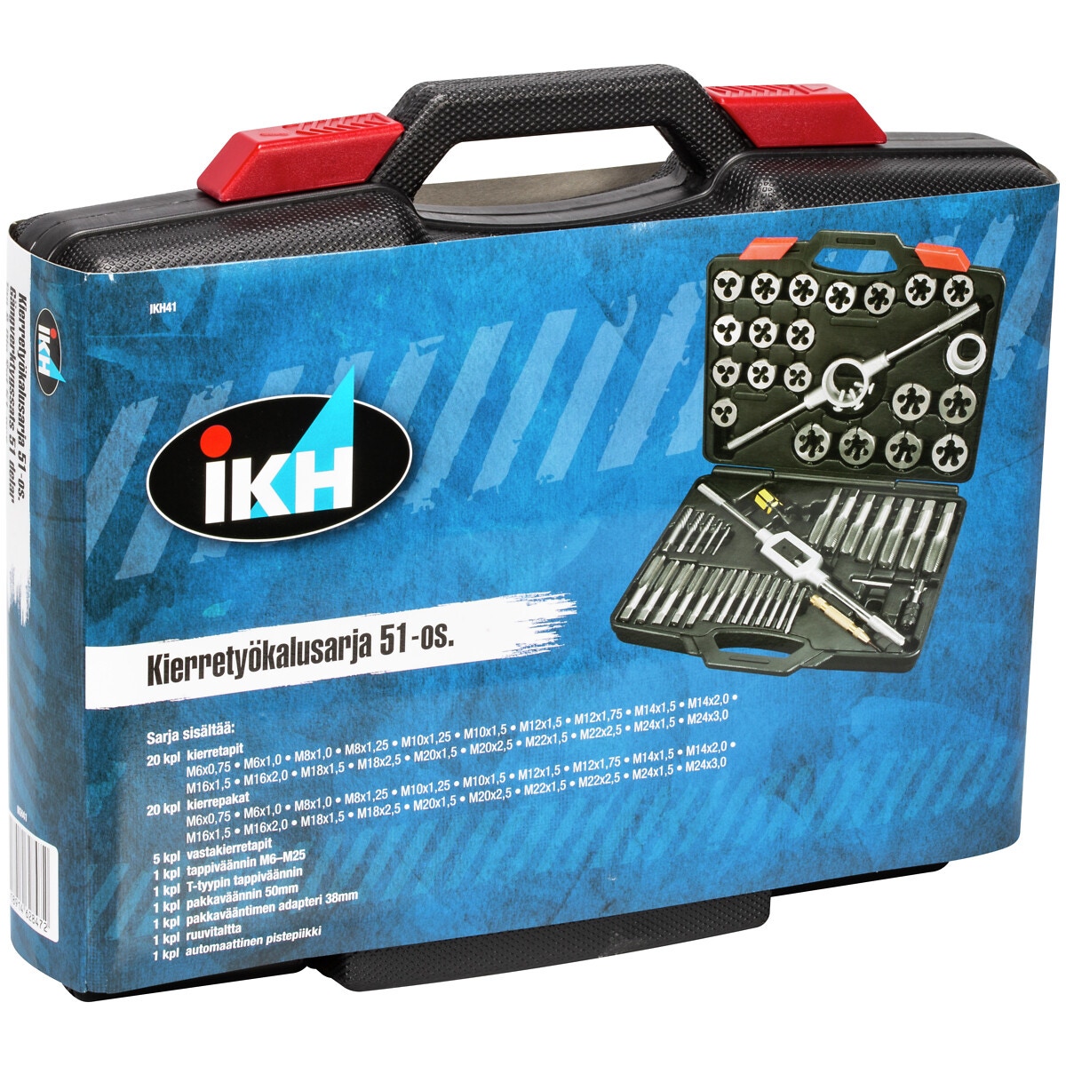 - gängtappar 20 st: M6x1,0 - M6x0,75 - M8x1,25 - M8x1,0 - M10x1,25 - M10x1,5 - M12x1,75 - M12x1,5 - M14x2,0 - M14x1,5 - M16x2,0 - M16x1,5 - M18x2,5 - M18x1,5 - M20x2,5 - M20x1,5 - M22x2,5 - M22x1,5 - M24x3,0 - M24x1,5