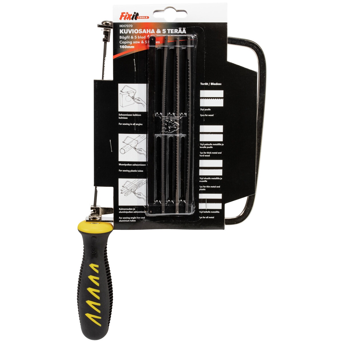 - blad: 2 st för trä, 1 st för metall, 1 st för tunn metall och plast, 1 st bågfilsblad för all metall