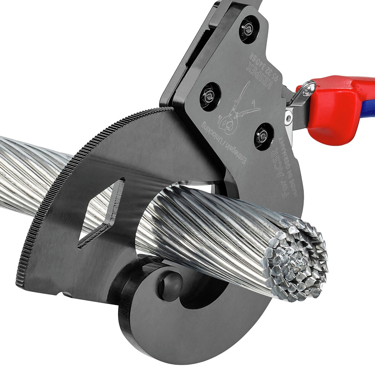 - skär av stålkärnans aluminium luftledning max. 32 mm i diameter för användning med en och två händer