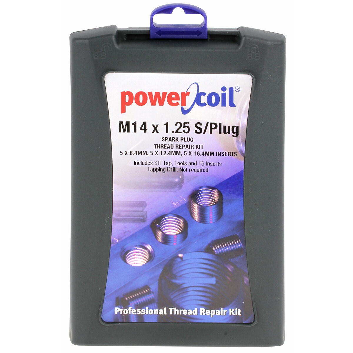 - 15 x gänginsats: 5 x MF14x1,25 (längd 8,4 mm) - 5 x MF14x1,25 (längd 12,4 mm) - 5 x MF14x1,25 (längd 16,4 mm)