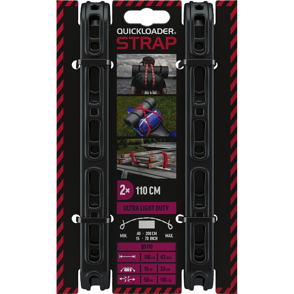 - QUICKLOADER® Strap QS110 är en mångsidig och praktisk lösning för alla dina behov av att fästa små föremål hemma och på vägen