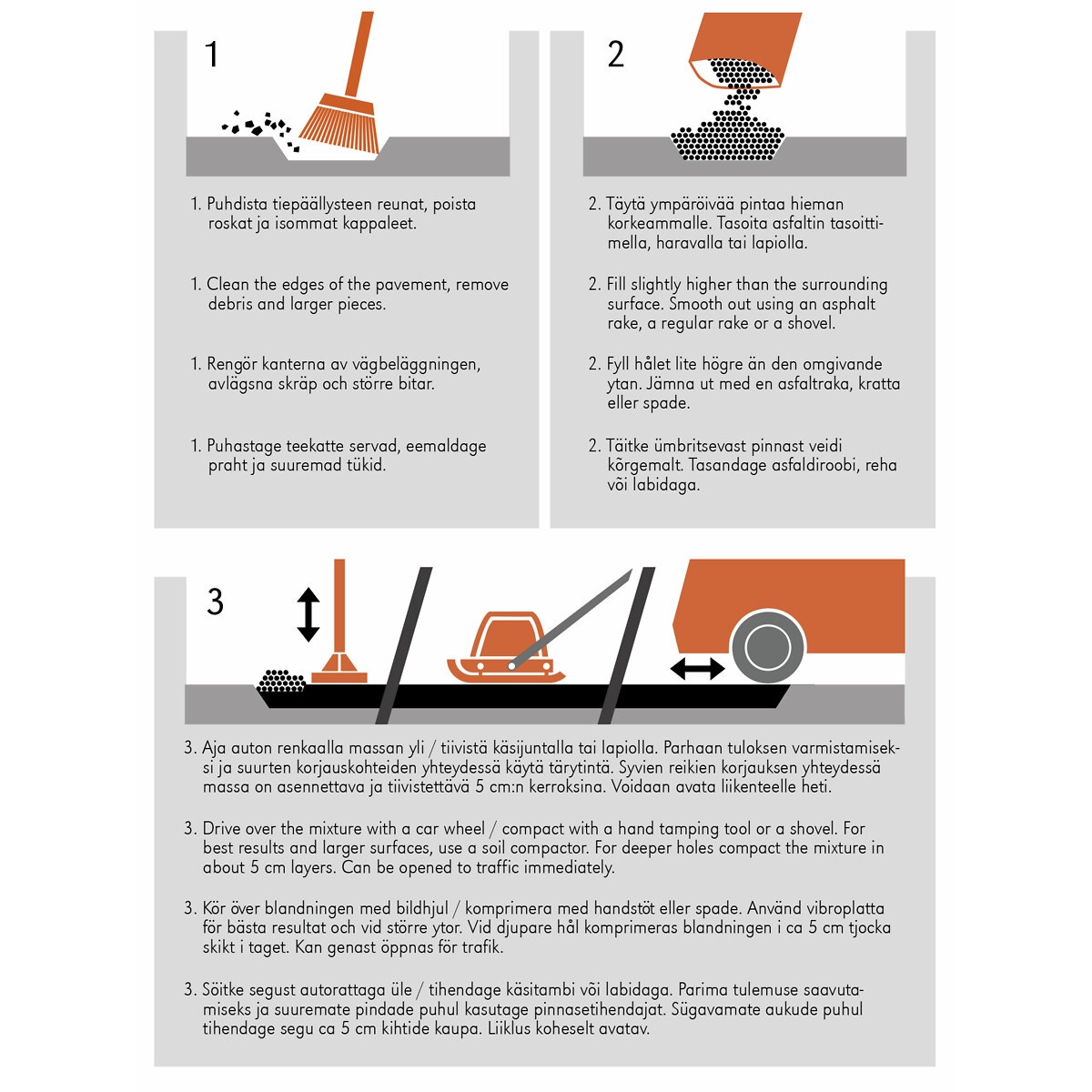 - applicering kräver inga specialredskap eller maskiner. Blandningen är användningsklar i förpackningen, ingen omrörning eller bearbetning behövs i förväg. Underlaget som ska lagas kräver ingen förbearbetning, blandningen vidhäftar mot såväl torra som våta ytor. Ett reparerat ställe kan genast öppnas för trafik